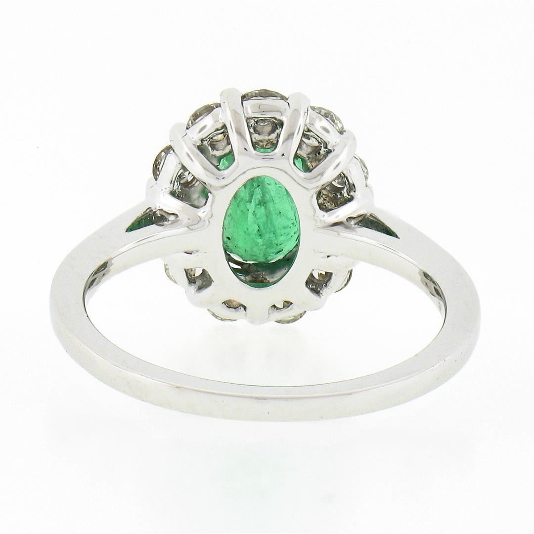 a new solid 18k yellow & white gold soliatire ring, with 1 oval cut natural emerald (1.38ct ), and a halo of 11 round brilliant cut natural diamonds (G/H - VS1/VS2 ; 0.73ctw). The ring is size 6.5, weighs a total of 4.25 grams, and measures 13mm wide.