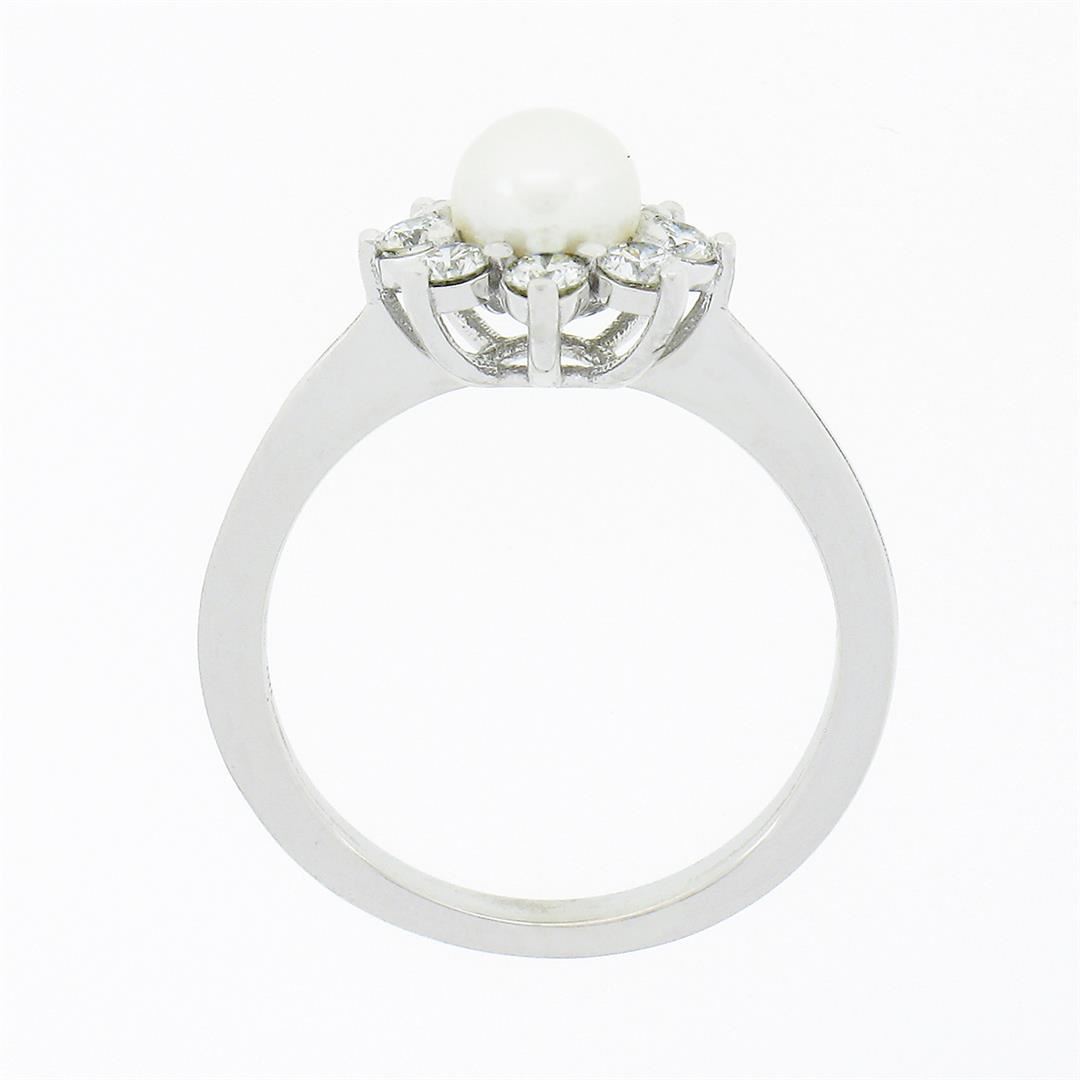 A new solid 18k white gold ring, with 1 round shape cultured pearl (5.25mm), surrounded with 8 round brilliant cut natural diamonds (G/H - VS1/VS2 ; 0.40ctw). The ring is size 5.0, weighs a total of 3.3 grams, and measures 10.60mm wide.