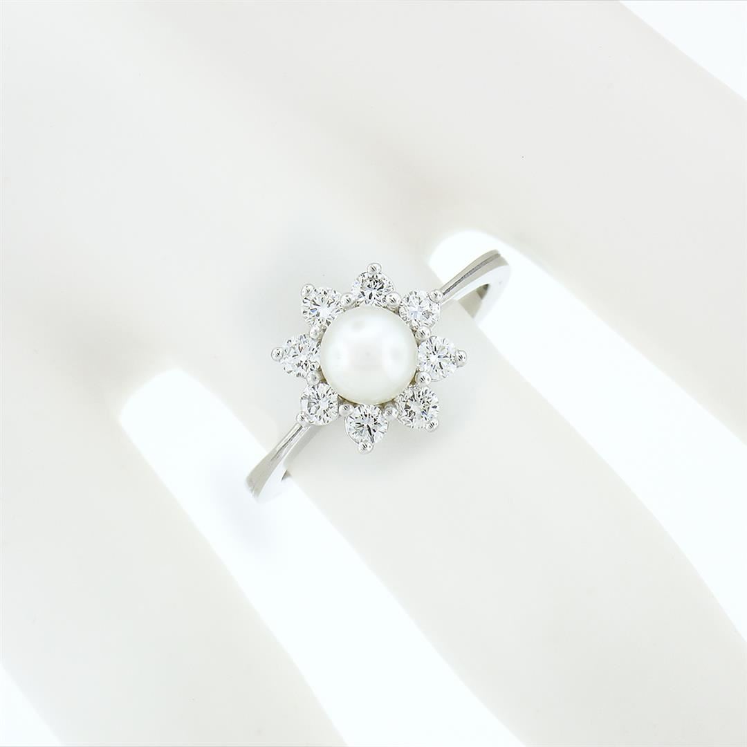 A new solid 18k white gold ring, with 1 round shape cultured pearl (5.25mm), surrounded with 8 round brilliant cut natural diamonds (G/H - VS1/VS2 ; 0.40ctw). The ring is size 5.0, weighs a total of 3.3 grams, and measures 10.60mm wide.