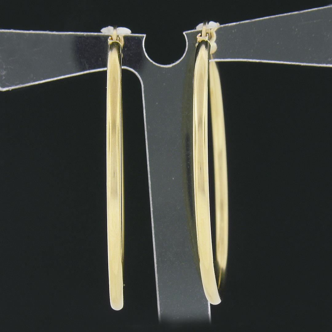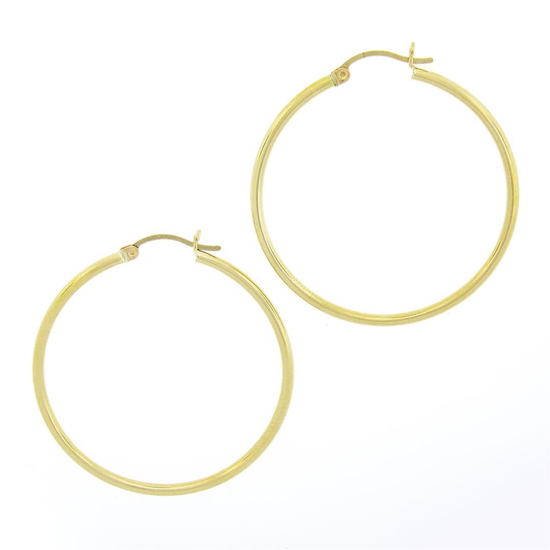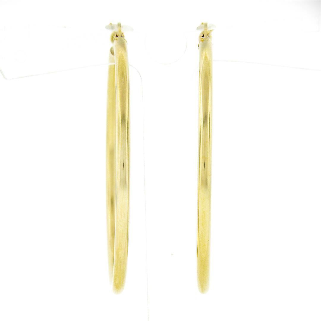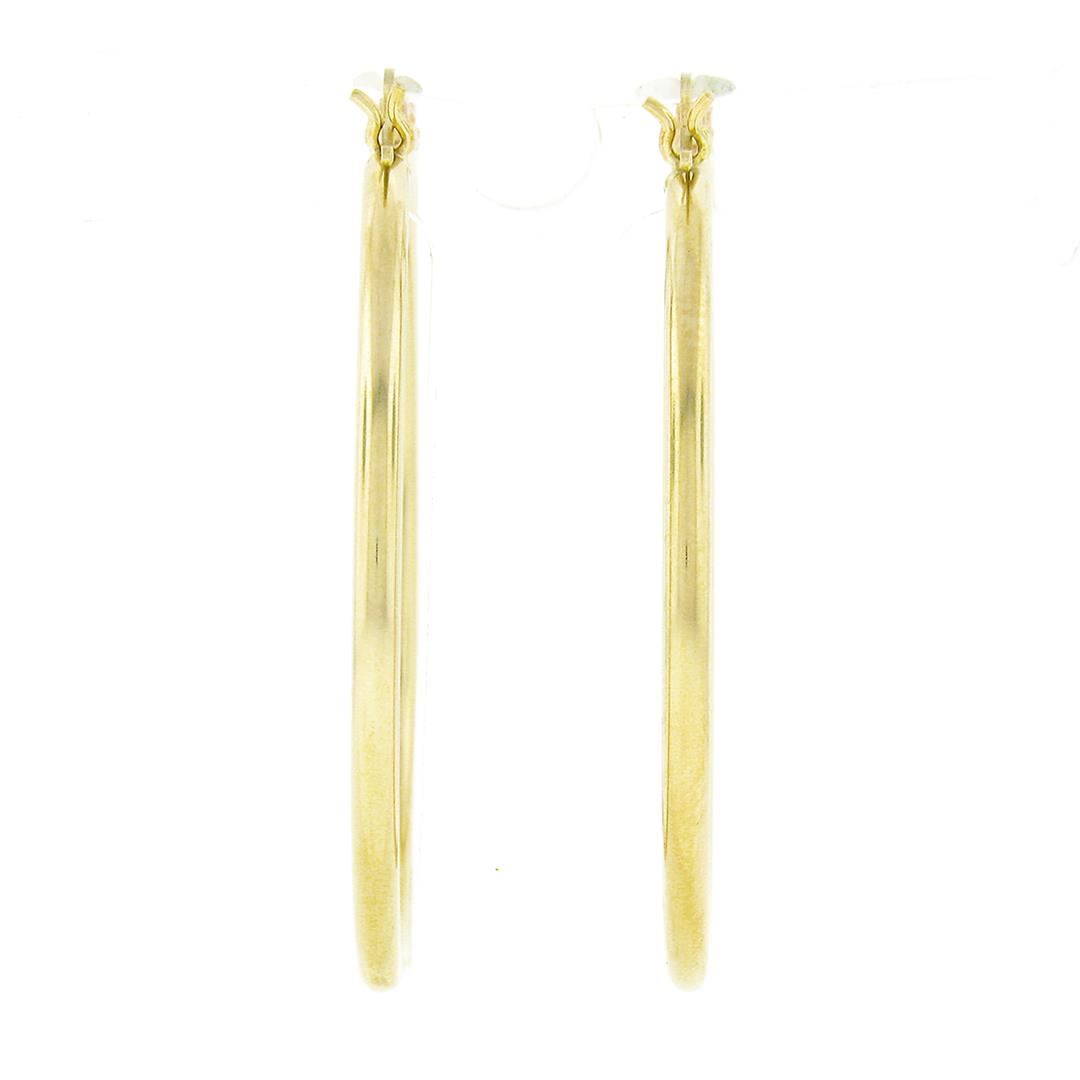 A new solid 14k yellow gold large hoop earrings. The earrings measure approximately 39.60mm in diameter and weigh a total of 2.68 grams.