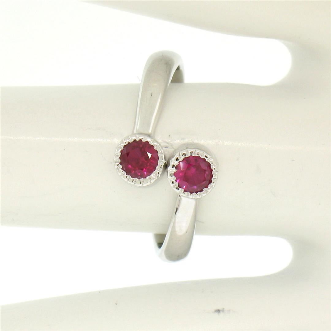A new solid 14k white gold bypass ring, featuring 2 round cut natural rubies (0.44ctw). The ring is size 6.0, weighs a total of 2.6 grams, and measures 9.17mm wide.