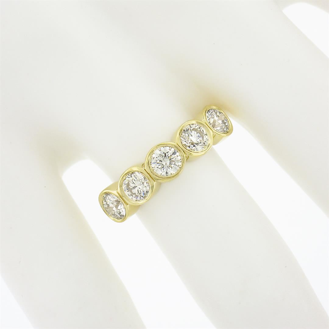 A new solid 18k yellow gold band ring, with 5 round brilliant cut natural diamonds (F/G - VS1/VS ; 1.21ctw). The ring is size 6.0, weighs a total of 5.50 grams, and measures 5.0mm wide.