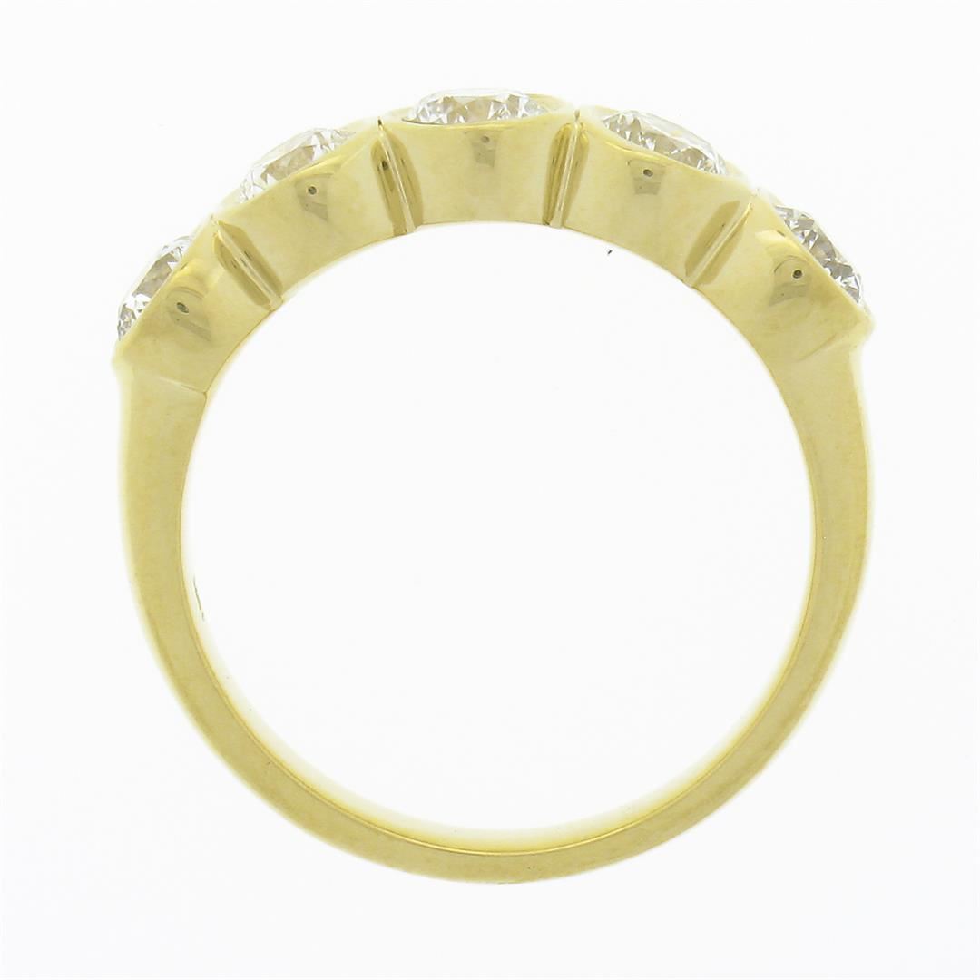 A new solid 18k yellow gold band ring, with 5 round brilliant cut natural diamonds (F/G - VS1/VS ; 1.21ctw). The ring is size 6.0, weighs a total of 5.50 grams, and measures 5.0mm wide.