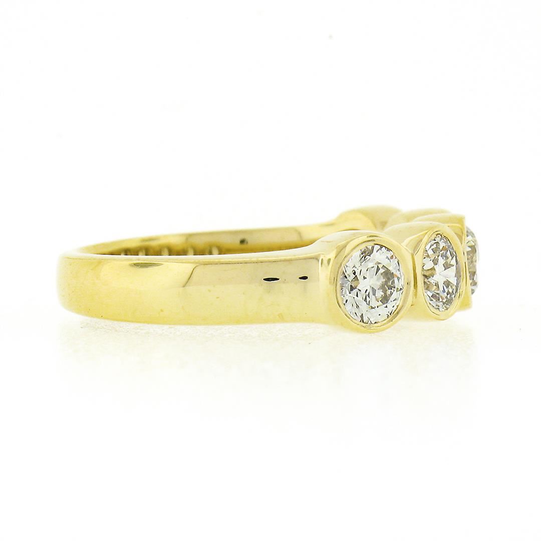 A new solid 18k yellow gold band ring, with 5 round brilliant cut natural diamonds (F/G - VS1/VS ; 1.21ctw). The ring is size 6.0, weighs a total of 5.50 grams, and measures 5.0mm wide.