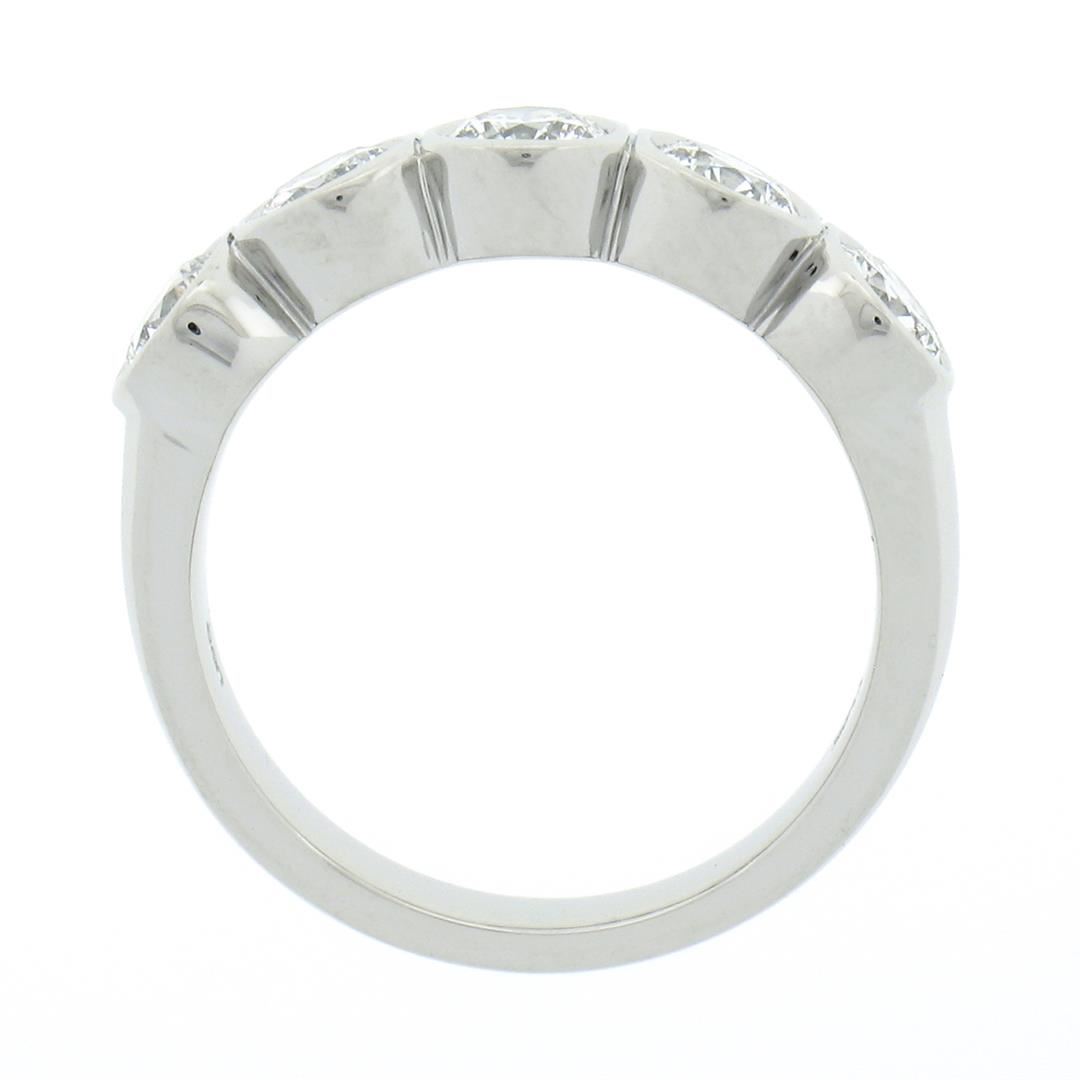 A new solid platinum band ring, with 5 round brilliant cut natural diamonds ( F/G - VS1/VS2 ; 1.19ctw). The ring is size 5.5, weighs a total of 8.13 grams, and measures 5.15mm wide.