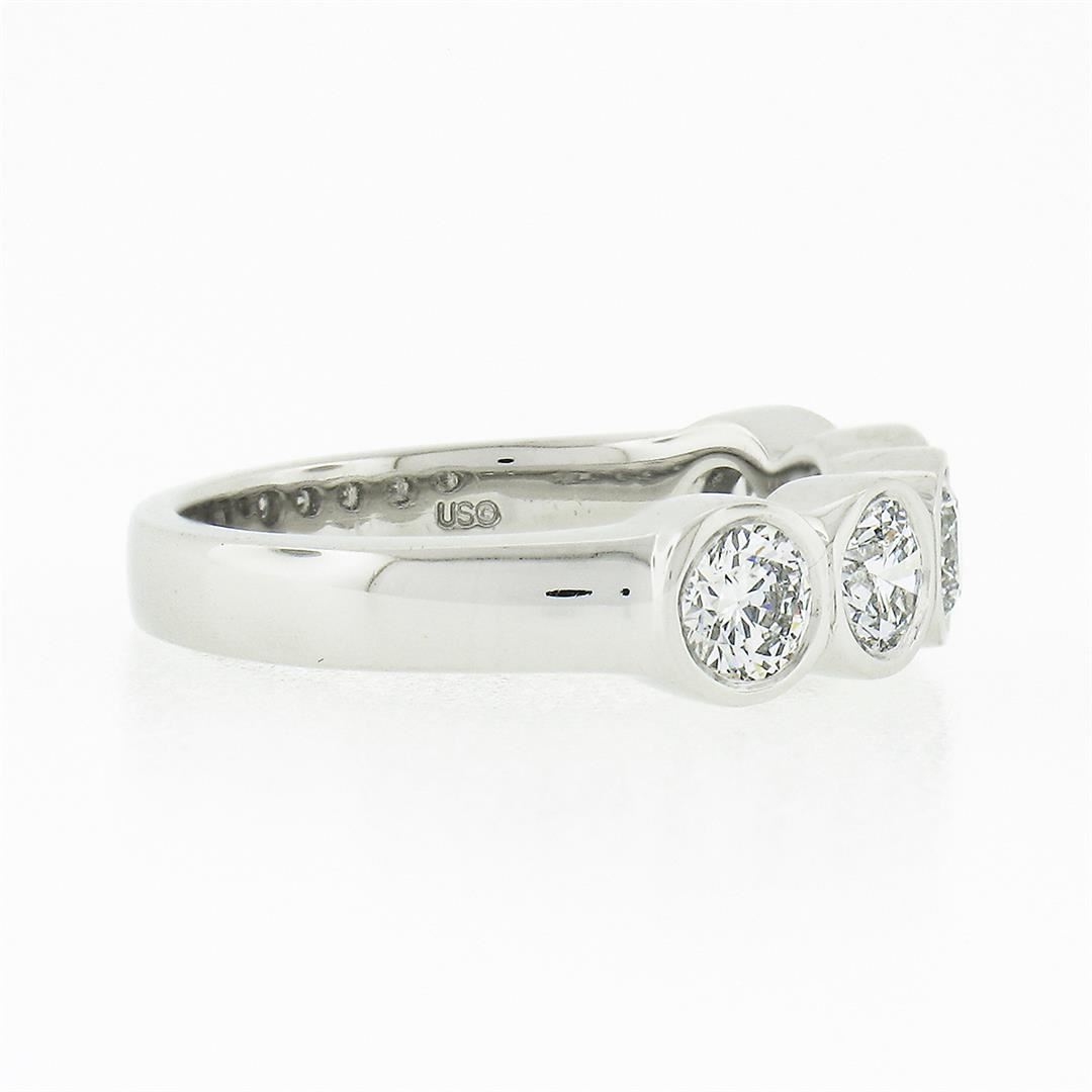 A new solid platinum band ring, with 5 round brilliant cut natural diamonds ( F/G - VS1/VS2 ; 1.19ctw). The ring is size 5.5, weighs a total of 8.13 grams, and measures 5.15mm wide.