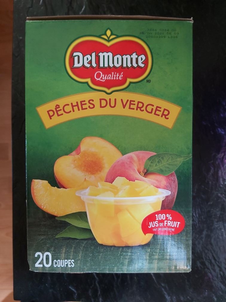 NEW DEL MONTE ORCHARD PEACHES 20 CUPS BOX 100% FRUIT JUICE BB/MA 2021 DE 03