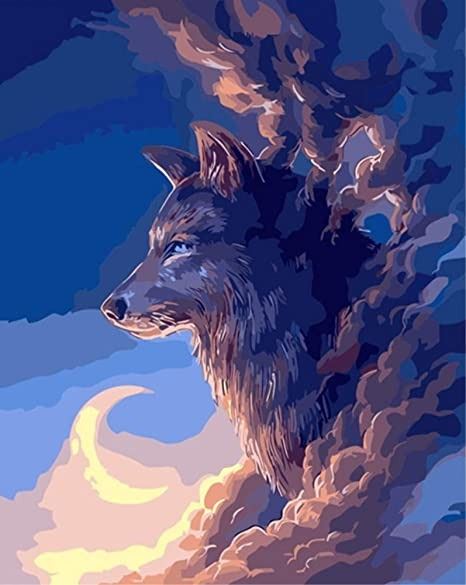 MOON AND WOLF, PAINT BRUSHES AND ACRYLIC PAINT INCLUDED, 20 X 16", ANTI STRESS ART, ALL PARTS AND PIECES SEALED, ORIGINAL BOX, AMZ SES