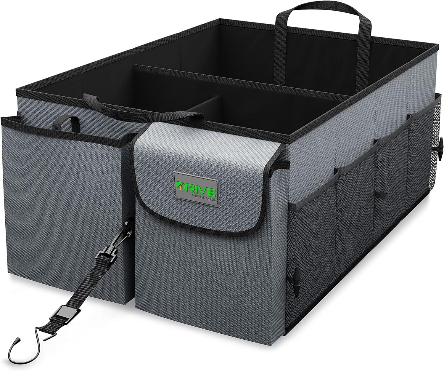 DURABLE, COLLAPSIBLE TRUNK ORGANIZER WITH COMPARTMENTS AND SECURE TIE DOWN STRAP SYSTEM. UNPACKED PRODUCT, DOES NOT COME WITH BOX. AMZ SES