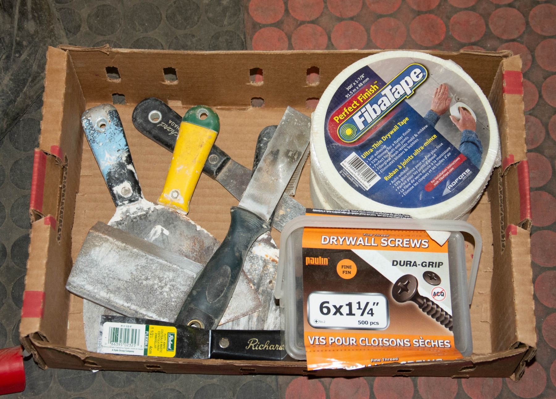 NEW DRYWALL TAPE, SCREWS, PUDDY KNIVES