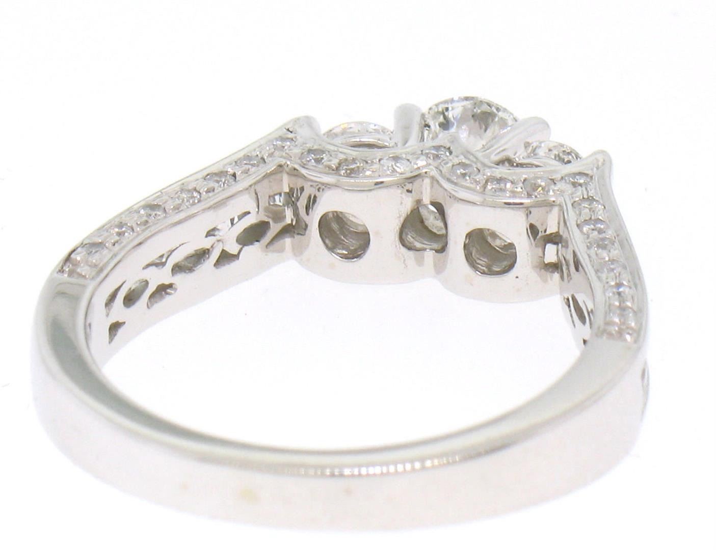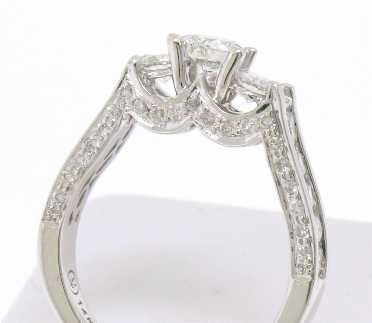 A new solid 14k white gold engagement ring, with 3 round brilliant cut natural diamonds (0.80ctw), and 10 natural diamonds (0.65ctw), with numerous diamonds (0.40ctw).The ring is size 7, weighs a total of 5.30 grams, and measures 4.60mm wide.
