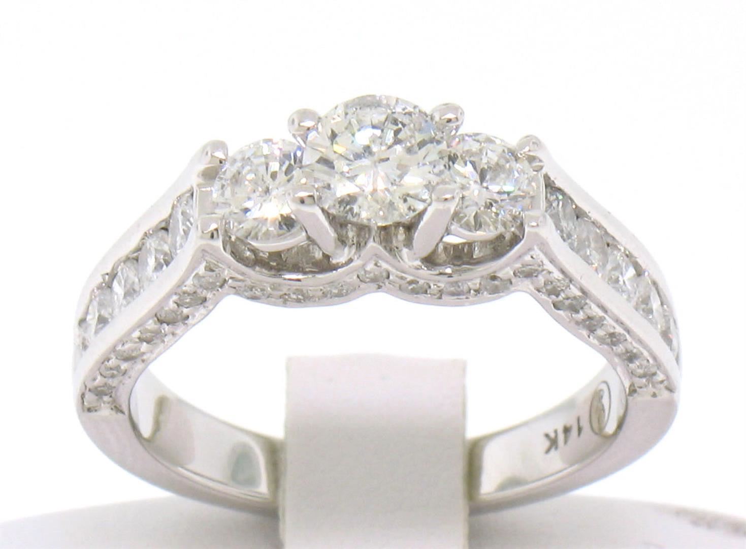A new solid 14k white gold engagement ring, with 3 round brilliant cut natural diamonds (0.80ctw), and 10 natural diamonds (0.65ctw), with numerous diamonds (0.40ctw).The ring is size 7, weighs a total of 5.30 grams, and measures 4.60mm wide.