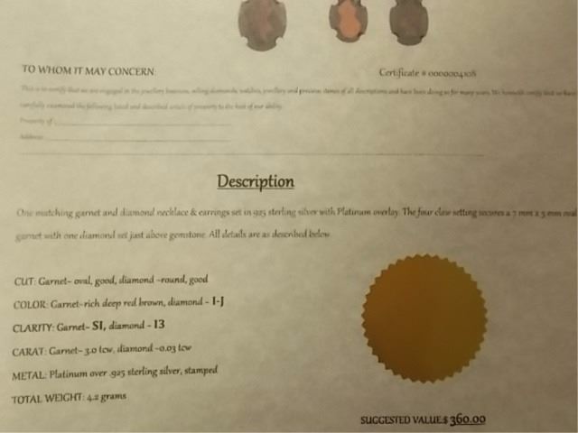 NEW EARRINGS & NECKLACE SET - 3CT OVAL FACETED GARNET & DIAMONDS IN STERLING SILVER SETTING - INCLUDES $360 CERTIFICATE