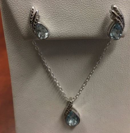 NEW EARRINGS & NECKLACE SET - NEW 2.5CT PEAR FACETED BLUE TOPAZ & DIAMONDS IN STERLING SILVER SETTING - INCLUDES $425 CERTIFICATE