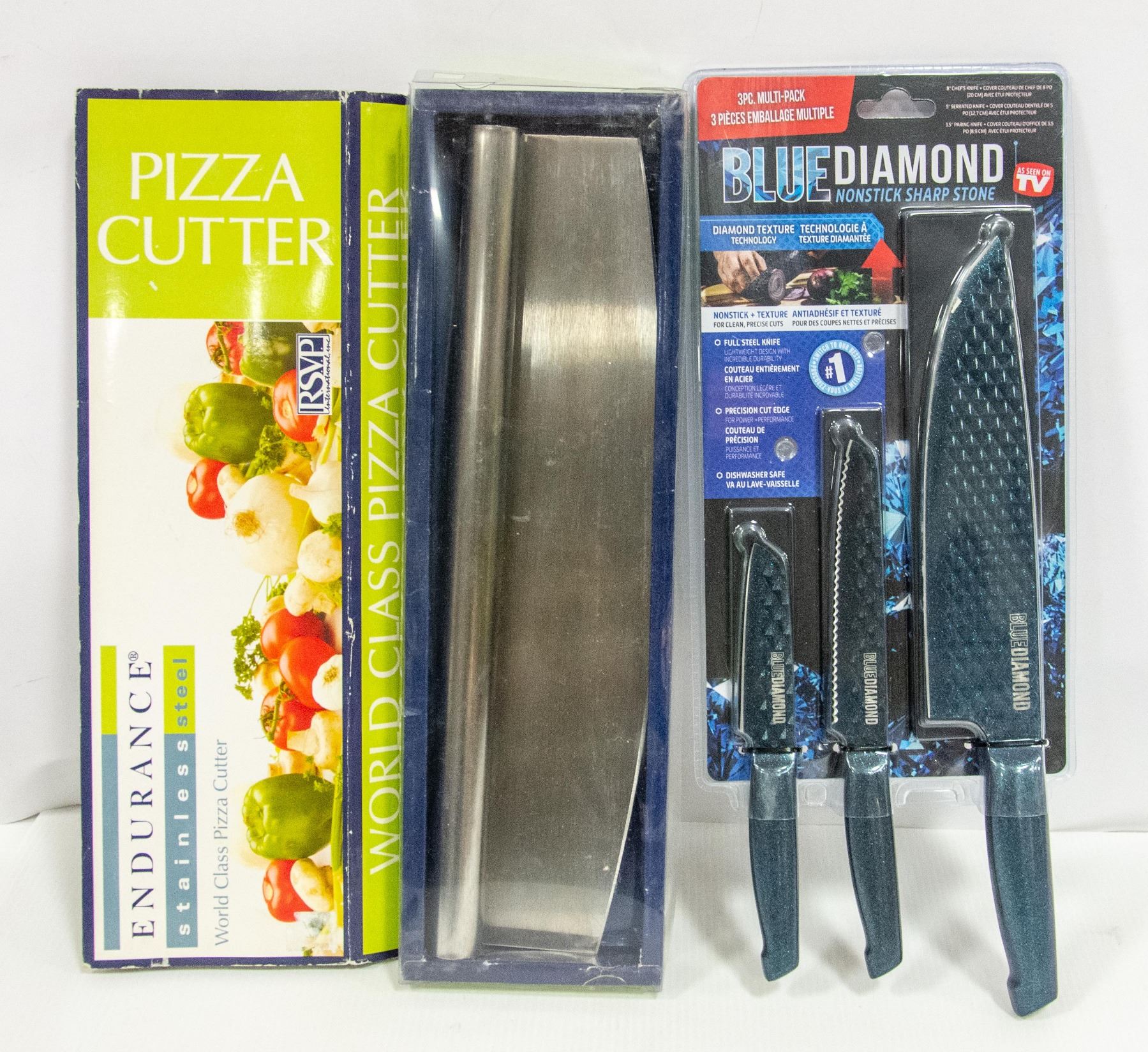 STAINLESS STEEL PIZZA CUTTER 14" & SEALED BLUEDIAMOND 3 PC KNIFE SET