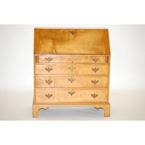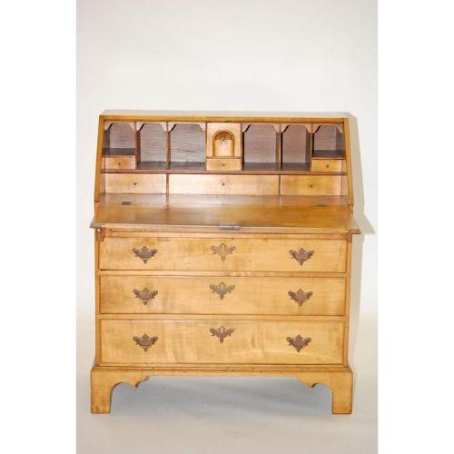 NEW ENGLAND CHIPPENDALE SLANT FRONT DESK-MAPLE DESK W/ 4 GRADUATED DRAWERS, FITTED INTERIOR W/ SHELL CARVED DRAWER, MOLDED EDGES, BRACKET BASE & BRASS HARDWARE (42" T X 36 1/4" W X 18 1/2" D) - WEAR, IMPERFECTIONS