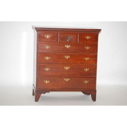 NEW ENGLAND CHIPPENDALE TALL CHEST - CHERRY CT VALLEY TYPE CHEST W/ 3 SHORT MOLDED DRAWERS OVER 4 MOLDED DRAWERS W/ DENTIL MOLDED CREST, BRACKET BASE & BATWING BRASSES (44 1/4" T X 40" W X 19 1/2" D) - WEAR, REPAIRS, REPLACEMENTS, IMPERFECTIONS