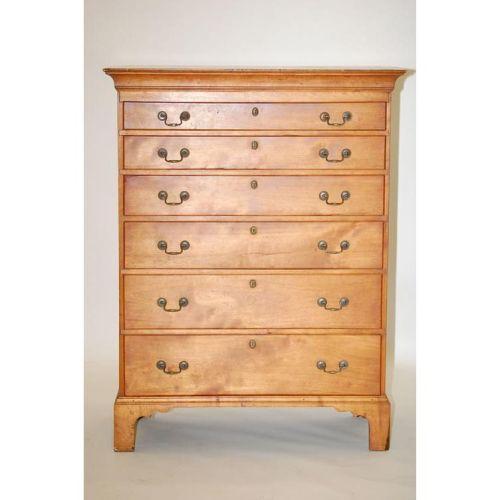 NEW ENGLAND CHIPPENDALE TALL CHEST - MAPLE & BIRCH CHEST W/ 6 GRADUATED DRAWERS, COVE MOLDED LID, MOLDED DRAWER FRONTS, BRACKET FEET & PERIOD BAIL BRASSES (51 1/2" T X 36" W X 18 1/4" D) - WEAR, SMALL REPAIRS, IMPERFECTIONS