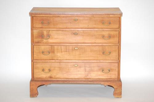 NEW ENGLAND CHIPPENDALE TIGER MAPLE CHEST - MAPLE CHEST W/ 4 MOLDED DRAWERS, MOLDED & SHAPED BRACKET BASE, BAIL BRASSES & OVAL BRASS ESCUTCHEONS (35" T X 36 1/2" W X 18" D) - WEAR, REPAIRS, REPLACEMENTS, IMPERFECTIONS