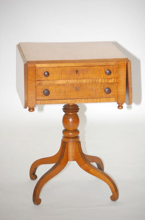 NEW ENGLAND CLASSICAL TIGER MAPLE WORK TABLE - CLASSICAL EMPIRE TIGER MAPLE DROPLEAF STAND W/ 2 GRADUATED DRAWERS, SHAPED LEAVES, TURNED SHAFT & SCROLLED LEGS (29" T X 20 1/2" W X 19" D) - WEAR, BLEACHED, REPAIRS, IMPERFECTIONS