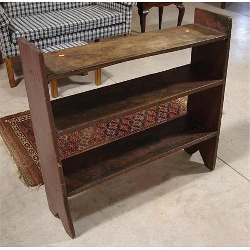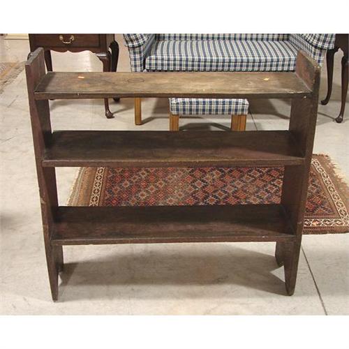 NEW ENGLAND CROCK BENCH. Shows signs of red paint. Has three shelves on cut-out boot jack feet. 30.5” H, 38” L, 10.25” W