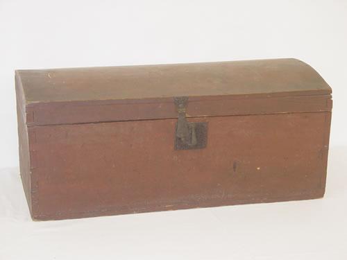NEW ENGLAND DOME TOP TRUNK-19TH CENT. PINE IN OLD RED PAINT W/ DOVETAIL CONSTRUCTION & IRON LOCK (10" T X 23 1/2" W X 11 7/8" D) - WEAR, SMALL SPLITS, IMPERFECTIONS;