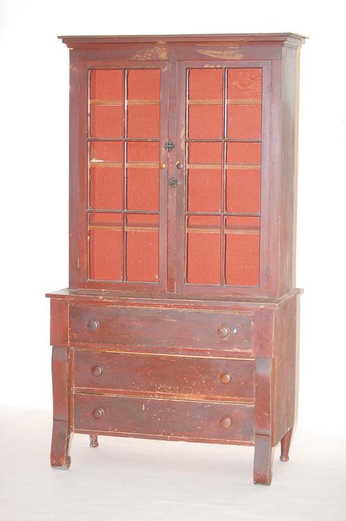 NEW ENGLAND EMPIRE BUREAU BOOKCASE-MAHOGANIZED COUNTRY PINE & POPLAR BOOKCASE W/ (2) 6-PANE GLASS DOORS, 4 SHELF RED PAINTED INTERIOR OVER 3 DRAWERS, MOLDED CREST & SCROLL FEET (80"T X 43"W X 21.5"D)-WEAR, STAIN & REPAIRS, SCRATCHES, IMPERFECTIONS