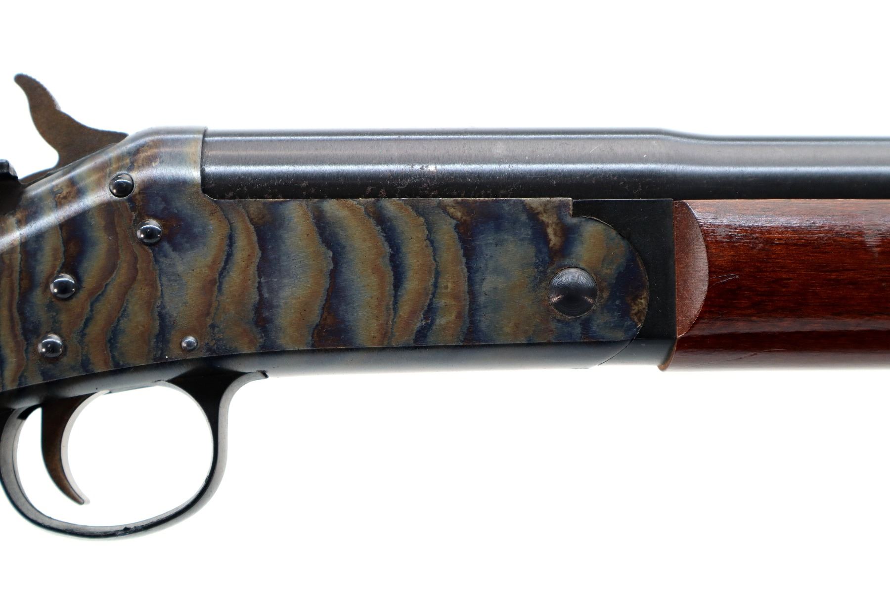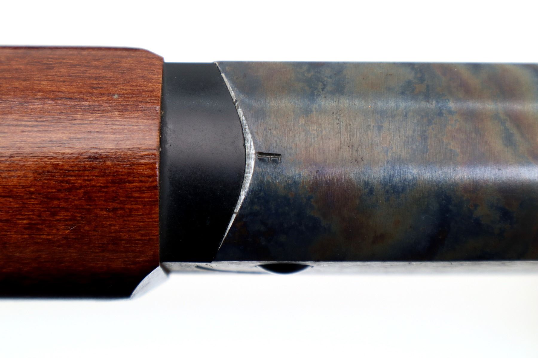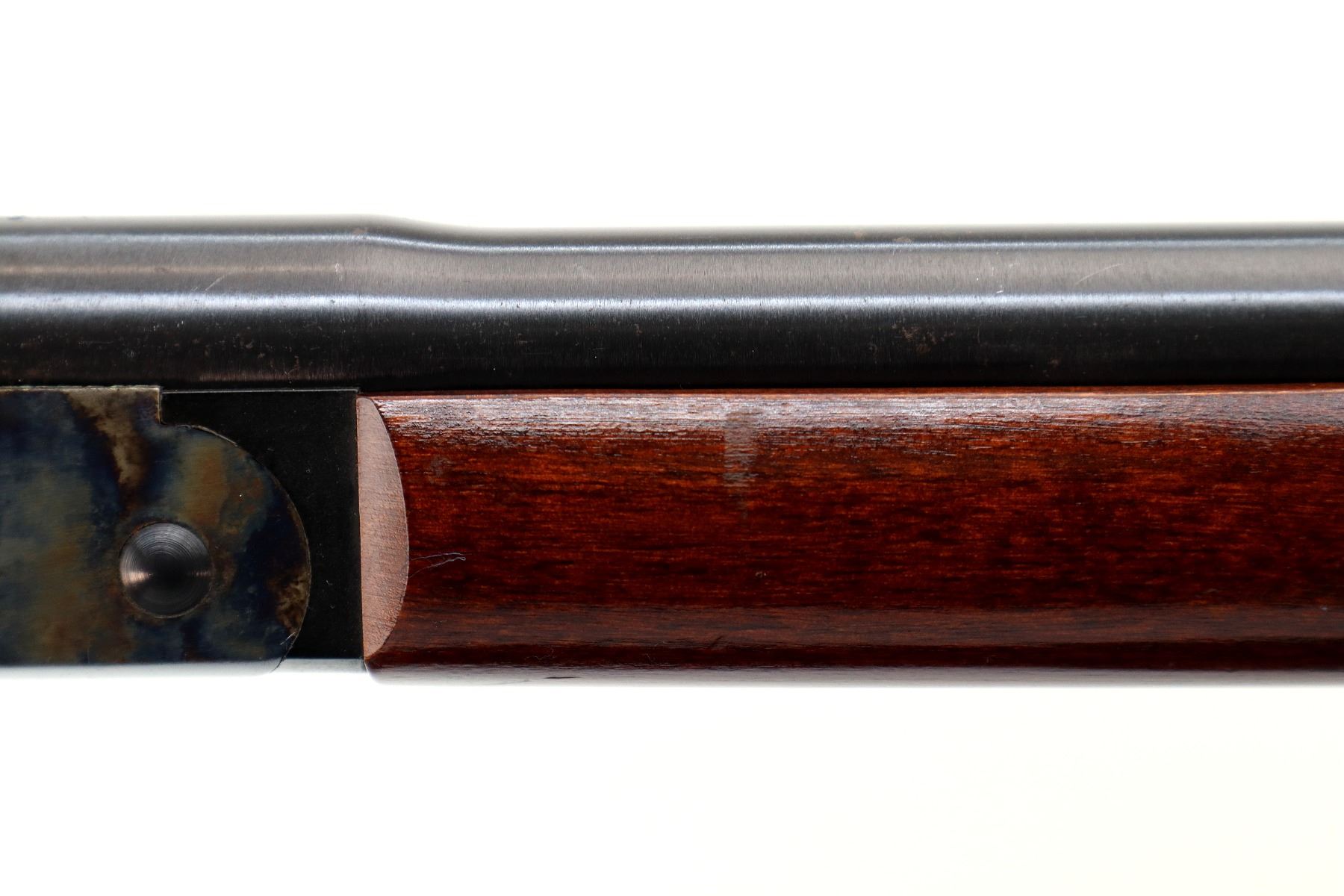 Main Description: Brass bead, blued round barrel, colour case hardened receiver, grooved spur hammer and opening lever, ejector. Two piece wood stocks, pistol grip, grooved black polymer butt plate.