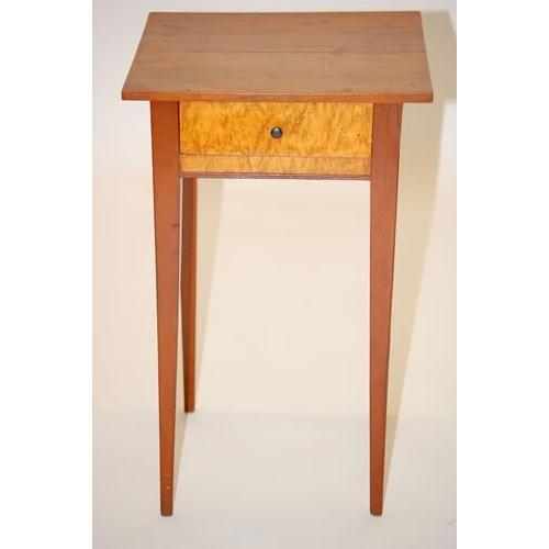 NEW ENGLAND HEPPLEWHITE 1 DRAWER STAND-CHERRY STAND W/ BIRDSEYE MAPLE DRAWER FRONT & SIDE PANELS W/ OVERHANGING TOP, MOLDED BASE EDGE, SQUARE TAPERED LEGS & BRASS KNOB (27 1/2" T X 14" W X 14" D; TOP-17" W X 16 1/4" D)-WEAR, REPAIRS, IMPERFECTIONS