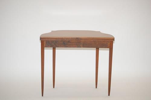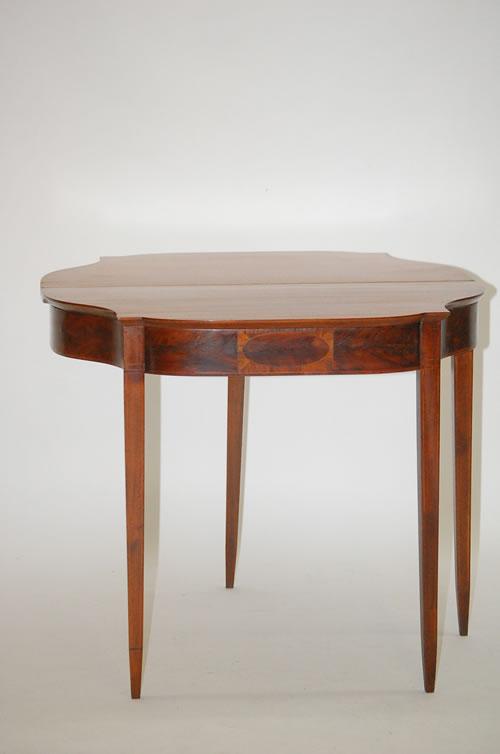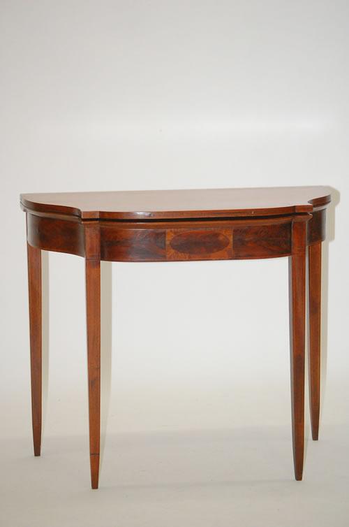 NEW ENGLAND HEPPLEWHITE CARD TABLE - MAHOGANY SHAPED FLIP TOP GAMING TABLE W/ SHAPED FRIEZE W/ ELLIPTICAL FRONT, SQUARE TAPERED LEGS & LINE, BAND & OVAL PANELED INLAY (29" T X 34 1/4" W X 18" D) - WEAR, REPAIRS, REPLACEMENTS, IMPERFECTIONS