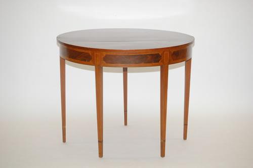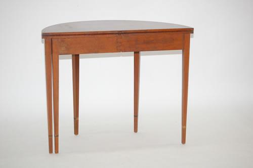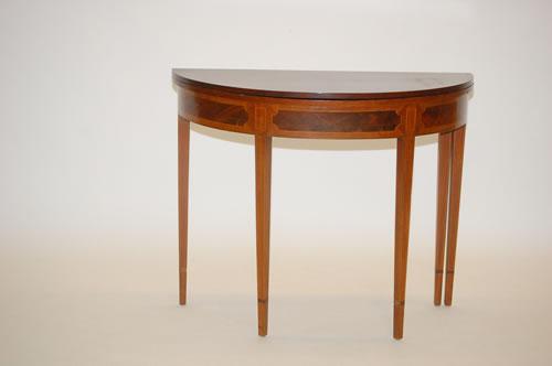 NEW ENGLAND HEPPLEWHITE DEMILUNE CARD TABLE - MAHOGANY FLIP TOP GAMING TABLE W/ LINE INLAID TOP, LINE & SHAPED PANEL INLAID FRIEZE & LINE & CUFF INLAID SQUARE TAPERED LEGS (30 1/2" T X 38" W X 18 3/4" D) - WEAR, REPAIRS, LOSSES, IMPERFECTIONS