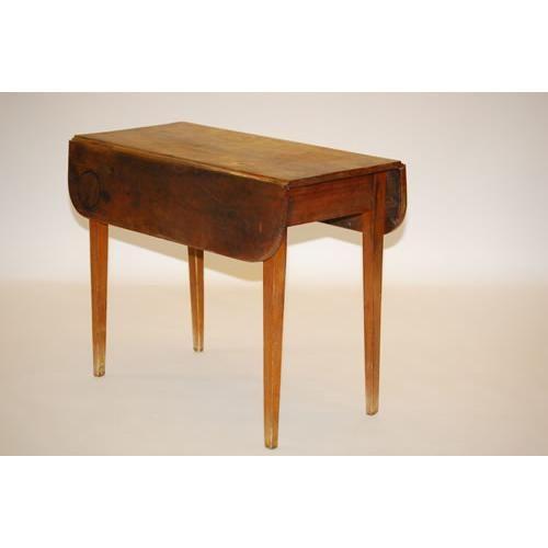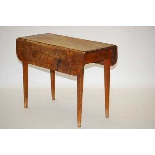 NEW ENGLAND HEPPLEWHITE DROPLEAF TABLE - MIXED WOODS INCLUDING MAPLE W/ SHORT SHAPED DROP LEAVES & SQUARE TAPERED LEGS (28" T X 36" L X 17" W) - WEAR, REPAIRS, IMPERFECTIONS