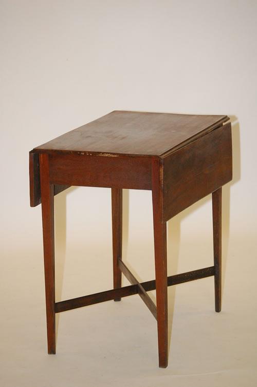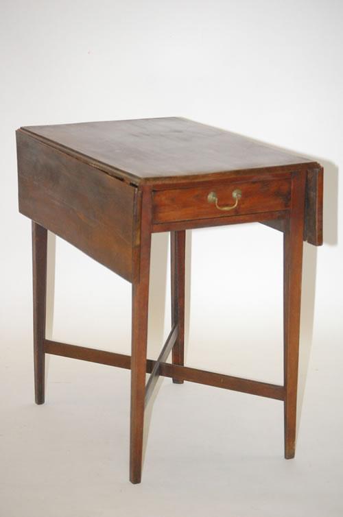 NEW ENGLAND HEPPLEWHITE PEMBROKE TABLE - DIMINUTIVE MAHOGANY PEMBROKE DROPLEAF TABLE W/ SINGLE DRAWER, SQUARE DROP LEAVES, SQUARE TAPERED LEGS W/ CROSS STRETCHER & BAIL BRASS HARDWARE (28 1/4" T X 29" L X 18 1/2" W) - WEAR, REPAIRS, IMPERFECTIONS