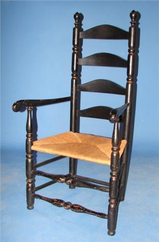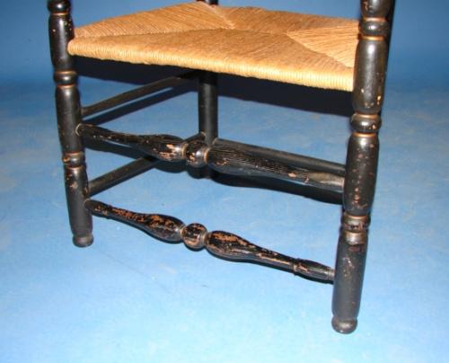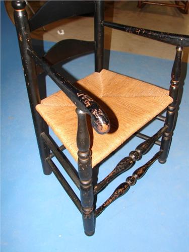 NEW ENGLAND LADDER BACK ARM CHAIR. Black paint. Rush bottom seat. Shows some loss to black paint. 47.5” H to top of back, 24” W, 20” D
