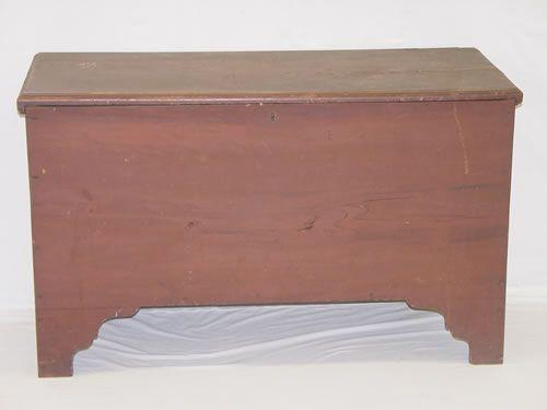 NEW ENGLAND LOW PINE BLANKET CHEST W/ MOLDED TOP, BOOTJACK ENDS & RED PAINT (25 1/2" X 42 1/2" W X 19" D) - DAMAGE TO LID, PAINT WEAR & IMPERFECTIONS