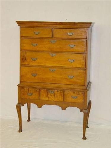 NEW ENGLAND MAPLE QUEEN ANNE 2 PC. FLAT TOP HIGHBOY W/ SOME TIGER MAPLE ON DRAWER FRONTS - REPAIRS & IMPERFECTIONS;