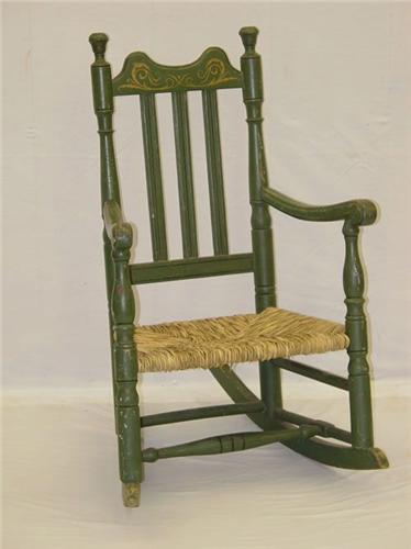 NEW ENGLAND PAINT DECORATED BANISTER BACK ARM CHAIR W/ ROLLED ARMS, SHAPED CREST & DECORATED GREEN PAINT (CONVERTED TO A ROCKING CHAIR) (35" T X 22" W X 25" D) - NEW RUSH SEAT, PAINT WEAR & IMPERFECTIONS