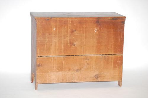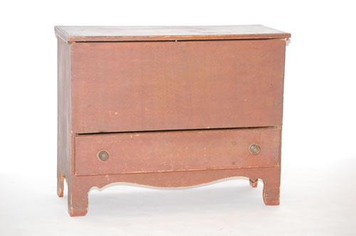 NEW ENGLAND PAINTED CHIPPENDALE 1 DRAWER BLANKET CHEST - PINE BLANKET CHEST W/ MOLDED DRAWER, SHAPED BRACKET BASE & APRON & CUT-OUT ENDS IN RED BROWN PUTTY GRAIN PAINT (32.5"T X 40.25"W X 16.5"D)-WEAR, SM. LOSSES, REPLACED BRASS HARDWARE, IMPERFECTIONS