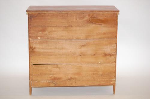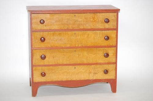 NEW ENGLAND PAINTED COUNTRY HEPPLEWHITE CHEST - RED PAINTED CHEST W/ 4 TIGER MAPLE GRAIN PAINTED DRAWERS, SIMPLE BRACKET BASE, SHAPED APRON, CUT-OUT ENDS & WOOD KNOBS (39 1/4" T X 40 1/2" W X 18" D) - WEAR, REPAIRS, IMPERFECTIONS