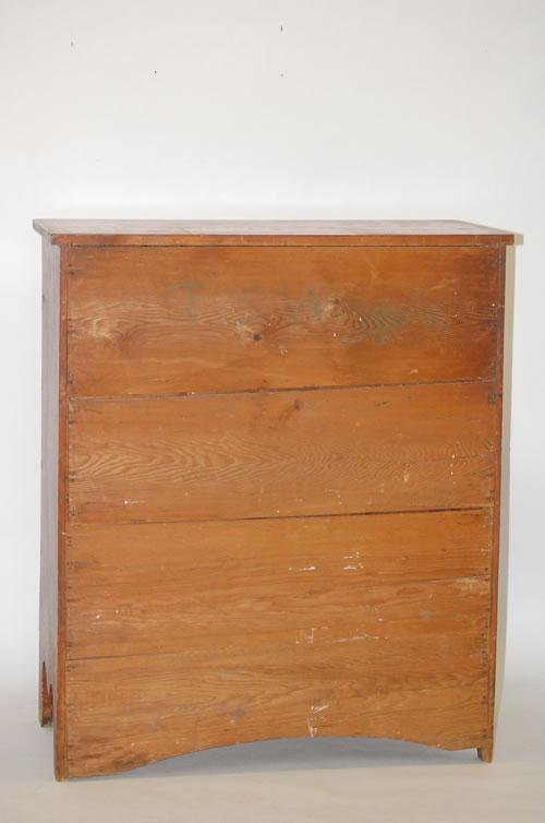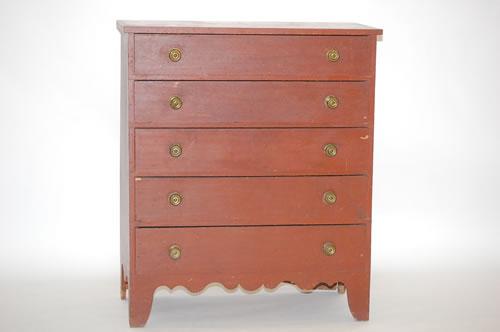 NEW ENGLAND PAINTED COUNTRY HEPPLEWHITE TALL CHEST - PINE 5 DRAWER GRADUATED CHEST W/ SIMPLE BRACKET BASE, FANCY SHAPED SKIRT, CUT-OUT ENDS & BRASS PULLS IN RED PAINT (46 3/4" T X 39 3/4" W X 19 1/4" D) - WEAR, SMALL LOSSES, IMPERFECTIONS