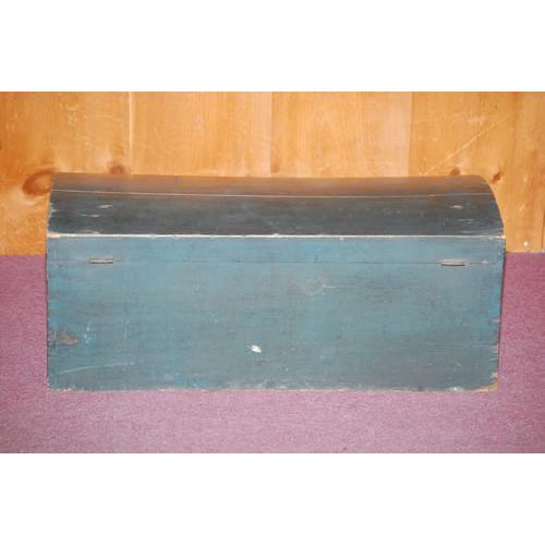 NEW ENGLAND PAINTED DOME TOP BOX - 19TH CENT. N.E. DOME TOP BOX W/ DOVETAIL CONSTRUCTION IN BLUE PAINT- MARKED INSIDE JASON E. SANDBORN IN PENCIL (12" T X 30" L X 13 1/2" D) - LOCK PLATE MISSING HASP, SPLIT IN TOP, CHIP ON BASE RIM, IMPERFECTIONS