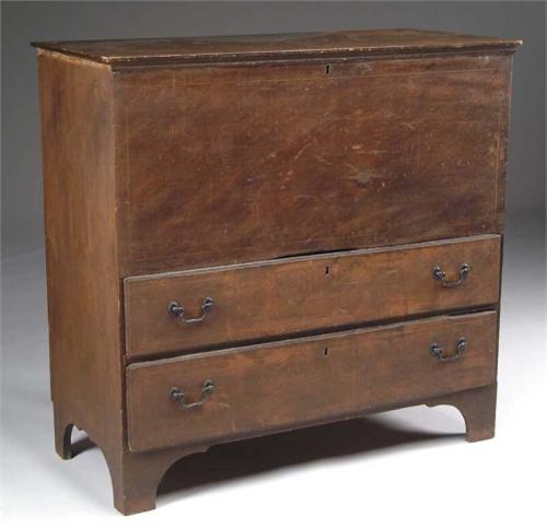 NEW ENGLAND PAINTED TWO DRAWER BLANKET CHEST. The molded edge lift top opens to reveal large compartment with lidded till. Under which are two thumb molded edge drawers raised on cutout feet. Pine secondary wood. The chest has a light grain painted reddish surface with simulated line inlay. Black bale handles. SIZE: 39-1/4” h x case 39-3/4” w x 18” d. CONDITION: Some lip damage and left side top molded edge present but missing bottom part. Some loss to original paint surface on top. Generally very good. 9-27607