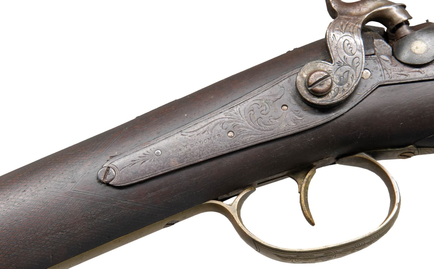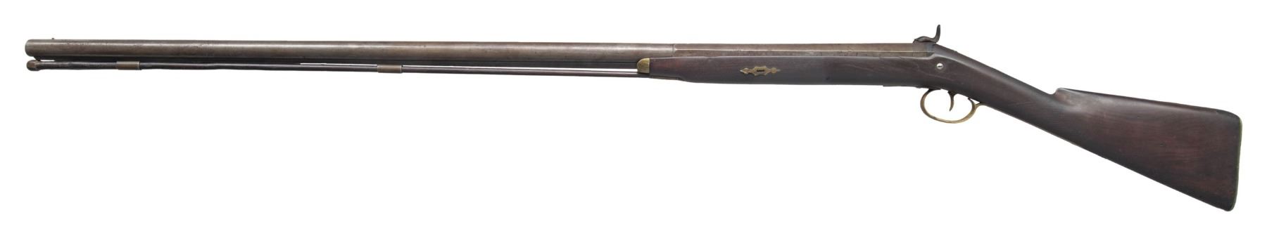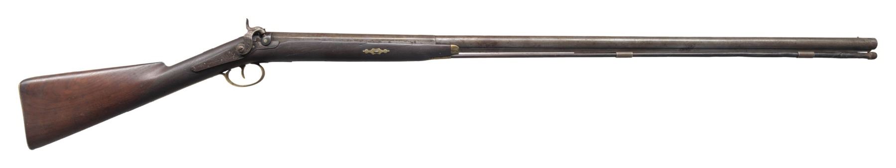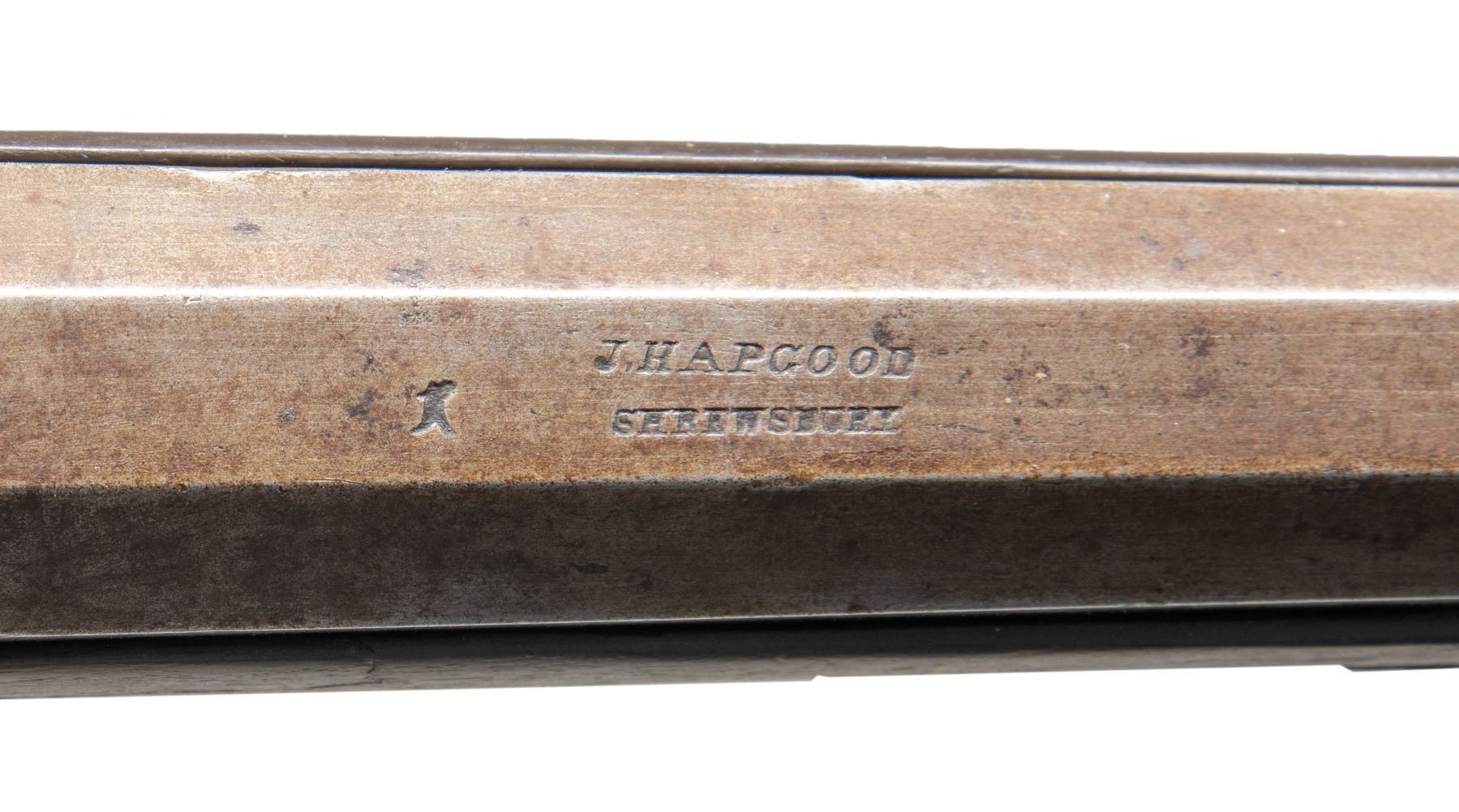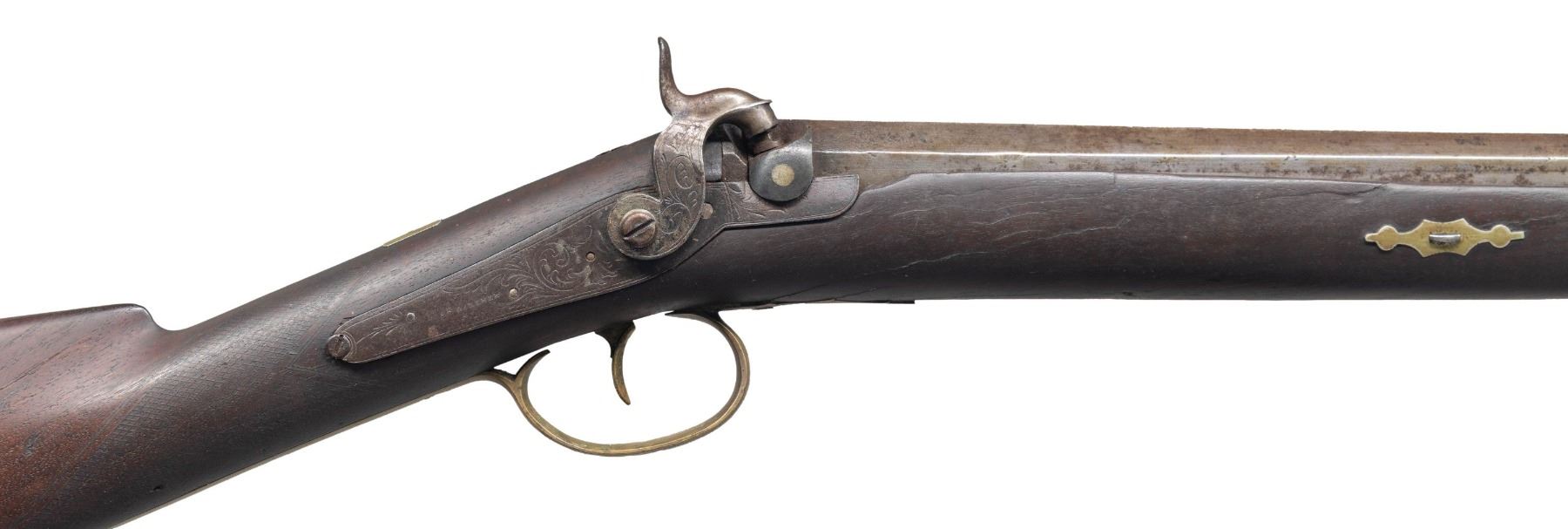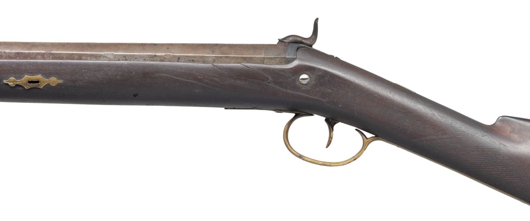 OF SHREWSBURY, MASS. Cal. 70. NSN. Per "American Gunsmiths" from Frank M. Sellers (2nd Ed.), Joab Hapgood (1804-1890) was mfg. Flintlock & Percussion guns in Shrewsbury, Mass. from 1826-1864, then Boston, Mass. from 1847-1864. Half round, half octagon 43" barrel w/ bright front bead. Top of barrel flat marked "J HAPGOOD / SHREWSBURY". Bolster style breech with back action hammer lock marked "JOSH GOLCHER". Hardwood ramrod. Wedge fastened walnut half stock. Brass musket style buttplate, pineapple finial triggerguard, nose cap, thimble, wedge escutcheons & 2 ramrod pipes. German silver name plate on top of wrist. Scroll engraving on lock, hammer, barrel tang. Wheat chaff & pigeon engraving on buttplate peak & triggerguard bow. CONDITION: gray/brown patina appearance on barrel & lock with spots of pitting & corrosion. Worn appearance to finish with numerous large cracks on both sides around breech. Stock also shows sm. gouges. Dark pitted bore. Appears mechanically fine. Right side of barrel chanel has large missing piece of wood. PROVENANCE: Estate Collection of Nicholas Apergis. (01-27469/MD). ANTIQUE. $500-800.