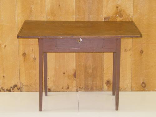 NEW ENGLAND PINE HEPPLEWHITE 1 DRAWER TAVERN TABLE W/ OVERHANGING TOP W/ BREADBOARD ENDS & PAINTED SQUARE TAPERED LEGS & BASE (27 3/4" T X 27 1/2" W X 17 1/2" D TOP= 40 3/4" W X 25 3/4" D) - WEAR, REPLACEMENT GLASS PULL, IMPERFECTIONS;