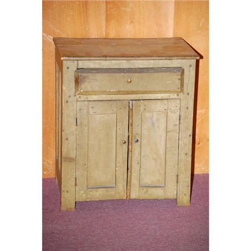 NEW ENGLAND PRIMITIVE PAINTED PINE COMMODE - LATE 19TH-EARLY 20TH CENT. FOLK ART COMMODE W/ 1 DRAWER & DOUBLE RECESSED PANELED W/ SIDES MADE FROM OLD ADV. BOXES IN OLD GREEN PAINT (23.5" T X 20" W X 13.5" D)- WEAR, LOSSES, CRACKS & IMPERFECTIONS