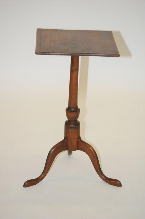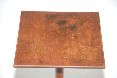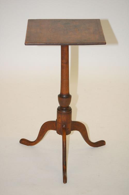 NEW ENGLAND QUEEN ANNE CANDLESTAND - MAPLE & CHERRY STAND W/ SQUARE CHERRY TOP W/ LATER SCRATCHED FLORAL & LINE DECORATION, TURNED SHAFT & CABRIOLE LEGS W/ SHOE FEET (25 3/4" T; 14" X 14" TOP) - OLD REPLACED TOP, WEAR, REPAIRS, IMPERFECTIONS