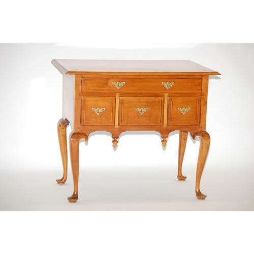 NEW ENGLAND QUEEN ANNE LOWBOY - MA CHERRY LOWBOY W/ LONG DRAWER OVER 3 SHORT DRAWERS W/ LINE INLAY, OVERHANGING TOP, SHAPED APRON W/ ACORN DROPS, CABRIOLE LEGS W/ PAD FEET (30"T X 35.5"W X 23.5"D) - WEAR, REPAIRS, ALTERATIONS, IMPERFECTIONS