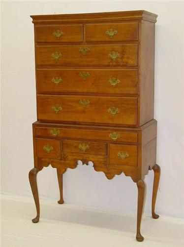NEW ENGLAND QUEEN ANNE MAPLE FLAT TOP HIGHBOY-TOP W/ 2 OVER 3 DRAWERS & LOWER W/ 1 LONG DRAWER OVER 3 SHORT DRAWERS, CABRIOLE LEGS & PAD FEET (66 1/2" T X 36" W APRON, CABRIOLE LEGS & PAD FEET (66 1/2" T, 36" W X 17" D) -REPAIRS & IMPERFECTIONS