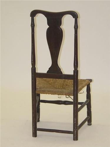 NEW ENGLAND QUEEN ANNE YOKE BACK SIDE CHAIR (MAPLE & MIXED WOODS) W/ VASE SPLAT, TURNED POSTS, LEGS & STRETCHERS & RUSH SEAT IN AN OLD MAHOGANIZED FINISH (39 1/2" T X 19" W X 14 1/2" D) - WEAR & IMPERFECTIONS