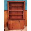 NEW ENGLAND ORIGINAL RED WASHED PEWTER CUPBOARD. Circa 1830-1840. Hutch top with three shelves with plate grooves over single blind door with two shelves. Has two board back with molded trim around hutch top. 72” H, 43” W, 19” D